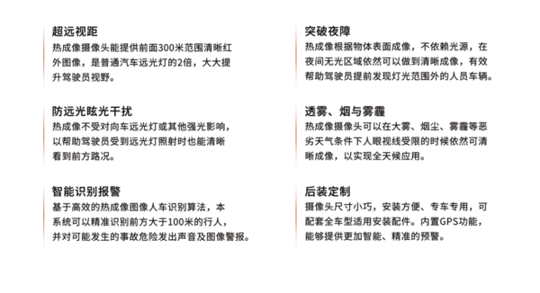 鑫泰HT-V系列車載熱成像攝像頭可以方便駕駛員在黑暗中提前識別出車輛前部區(qū)域的行人和車輛。攝像頭能將尚未出現(xiàn)在車輛照明視野中的發(fā)熱對象從其背景中提取出來,在屏幕上顯示,有效的改善駕駛員駕車體驗(yàn),提升駕駛安全系數(shù)。